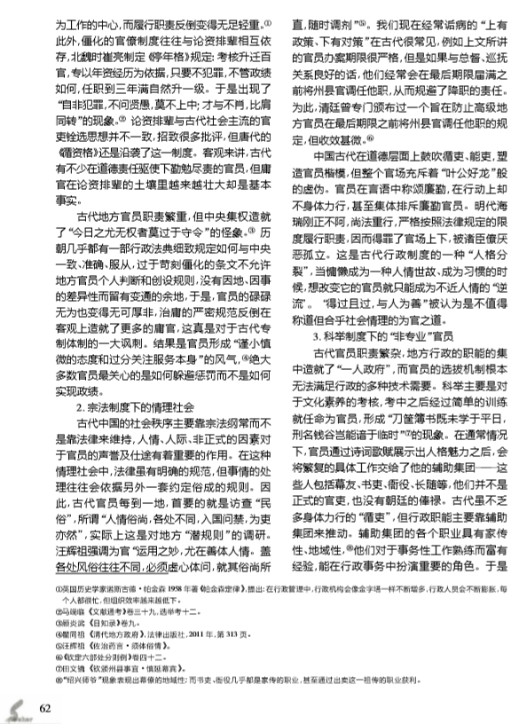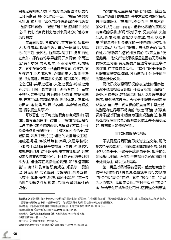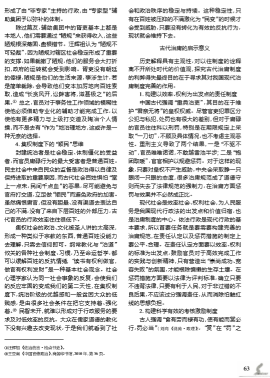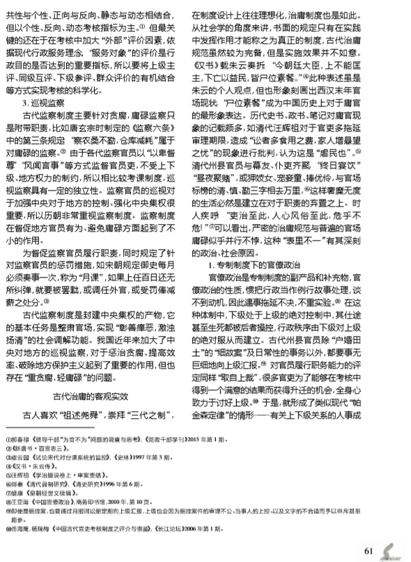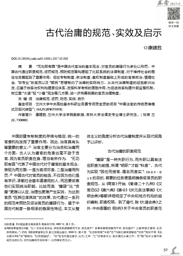 中国封建专制制度的存续与稳定,统一的官僚机构发挥了重要作用。因此,治官具有头等重要的意义。治官主要分为治贪和治庸两个方面。古人认为庸官的危害丝毫不逊于贪官,因为官员职责在身,理当有所作为。“无功即有罪”代表了中国古代对于庸官的基本观念,表现为两方面:一是为官须尽责,二是治庸用刑罚。中国古代对官员的铨选,不仅因为他们是有学识、承载社会基本道德观的人,而且要依靠他们实现统治职能。比较而言,“庸碌”比“贪腐”更难以认定,治理也更难产生实效。为达到官员“在其位谋其政”的效果,中国古代通过职责规范、惩罚规范、预防规范等构建起了比较系统的法律制度,对于维持社会的稳定与发展起到了重要作用。但在专制制度、宗法制度、集权制度基础上形成的官僚政治、情理社会、“非专业”的官员以及“顺民”思想制约了治庸的实际效力。从古代治庸制度的经验教训出发,应基于效率与权利构建责任体系、发挥科学考核的激励作用、为促进效率构建外部监督机制、树立重“大道”轻“小惠”观念等几方面,进一步完善我国的官员治理制度。
