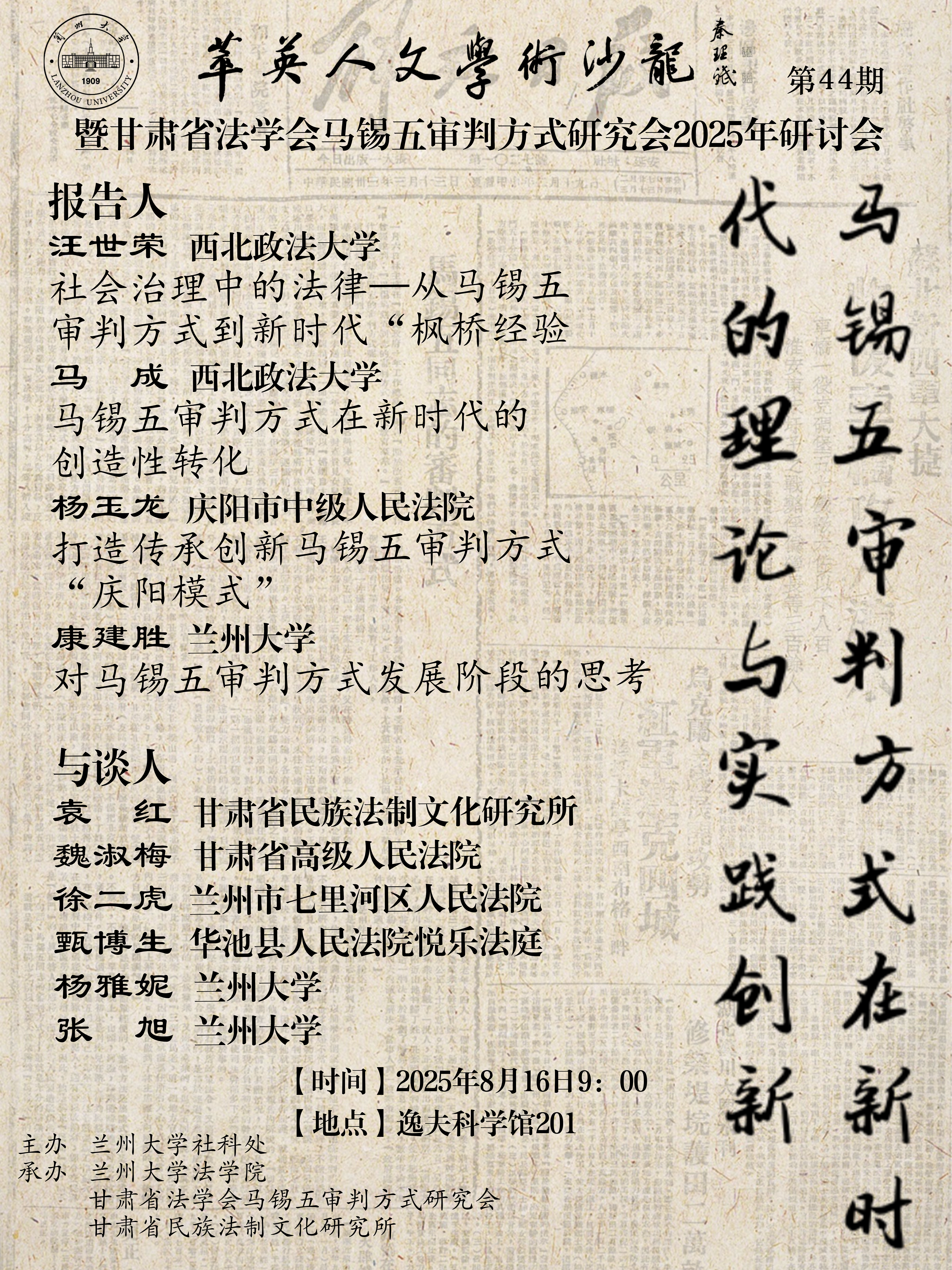 为进一步弘扬红色法治文化,在坚持和发展新时代“枫桥经验”背景下,更好发挥“马锡五审判方式”发源地的历史优势、地域优势、资源优势,进一步推动“马锡五审判方式”创造性转化、创新性发展。由永利集团88304官网在线登录社科处主办,永利集团88304官网在线登录、甘肃省法学会马锡五审判方式研究会、甘肃民族法制研究所联合承办的永利集团88304官网在线登录第四十四期萃英人文学术沙龙“马锡五审判方式在新时代的理论与实践创新”将于2025年8月16日上午9:00在城关校区西区逸夫科学馆201举行。欢迎广大师生参加!