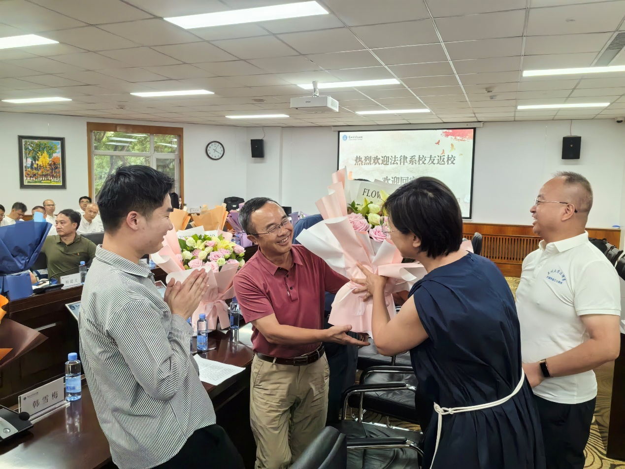 下午四时,座谈会在逸夫科学馆201会议室温情启幕。座谈会由1991级毕业生代表张智渊老师主持。会场内洋溢着久别重逢的喜悦,校友代表手捧馥郁花束,献给参加座谈会的老师和其他年级校友代表。芬芳承载着游子对母校栽培的感恩,更象征着法律人精神家园的生生不息。
